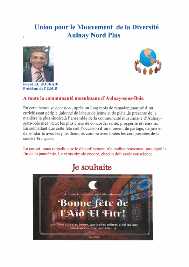 Fouad El Kouradi s’adresse à toute la communauté musulmane d’Aulnay-sous-Bois à l’occasion de l’Aïd el Fitr