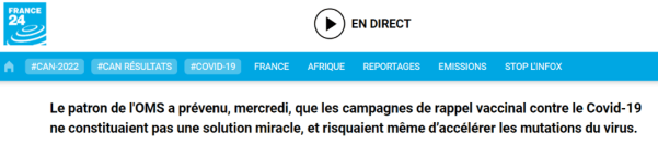 - Sylvie Briand, directrice à l’OMS des risques épidémiques et pandémiques constate que « les vaccins que l’on a actuellement ont très peu d’influence sur la circulation du virus. Il faut vraiment se poser la question : qu’est-ce que l’on veut obtenir avec la vaccination ? Le vaccin n’est pas le seul traitement. La cohésion de la société ne doit pas être négligée. »