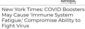 Le New York Times informe que « les injections de booster covid endommagent l’immunité, laissent le corps sans défense contre le virus. Trop d’injections peuvent causer une fatigue du système immunitaire et compromettre la capacité du corps à combattre le virus. »
