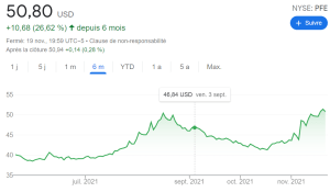 Nous avons appris que la Big Pharma Pfizer engrangeait environ 1000 dollars de bénéfices par seconde, et que l’action de la firme était au plus haut (cf graphique ci-contre). Avec la vaccination quasi-obligatoire de certains pays et les piqûres de rappel pour les populations adultes (le vaccin perd rapidement de son efficacité au bout de quelques mois), les actionnaires de Pfizer ont tout pour se réjouir. D’autres firmes comme Moderna profitent également de la situation. D’autres sont moins mercantiles comme Johnson & Johnson ou Astra Zeneca qui, pour le bien de l’humanité, ont préféré vendre leur vaccin au prix coûtant.