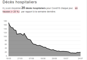Sa létalité : la courbe ci-après montre que malgré une légère augmentation, elle ne suit fort heureusement pas celle des cas positifs[5].