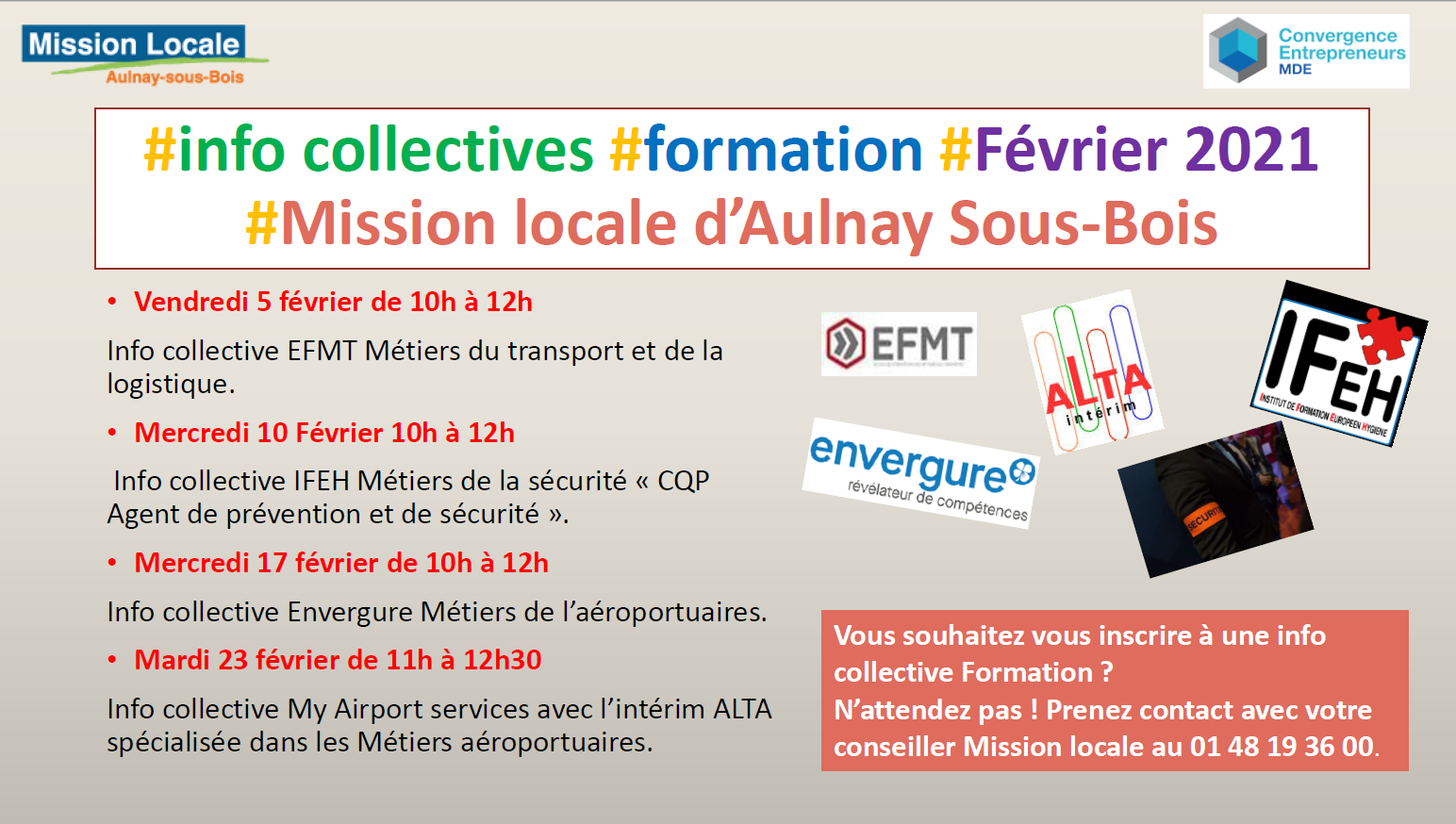 Inscrivez-vous auprès de votre conseiller mission locale au 01 48 19 36 00 aux informations collectives du mois de février.