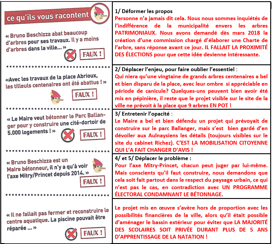 Dans le tract accessible en cliquant sur l’image ci-contre, l’association de soutien à la majorité municipale d’Aulnay énumère les sujets et apporte « des réponses », notamment sur l’indemnisation des agents, le financement d’une association cultuelle et le bétonnage de la ville.