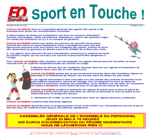 FORCE OUVRIÈRE estime que toutes les mesures de sécurité nécessaires doivent être mises en place rapidement. Nous n’accepterons plus que des agressions puissent avoir lieu contre nos collègues des sports, comme ce fut le cas récemment au gymnase du Moulin neuf et au COSEC de la Rose des vents. - Les agents nous font part de leurs inquiétudes concernant le matériel de tonte de certains engins qui ne sont plus aux normes et pourraient être dangereux à l’usage.
