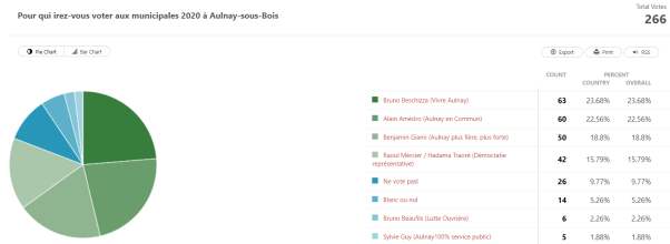 Aulnaycap a aussi été le seul blog à vous proposer une consultation pour le 1er tour des élections municipales 2020 à Aulnay-sous-Bois. Vous avez été 266 votants uniques à y participer.