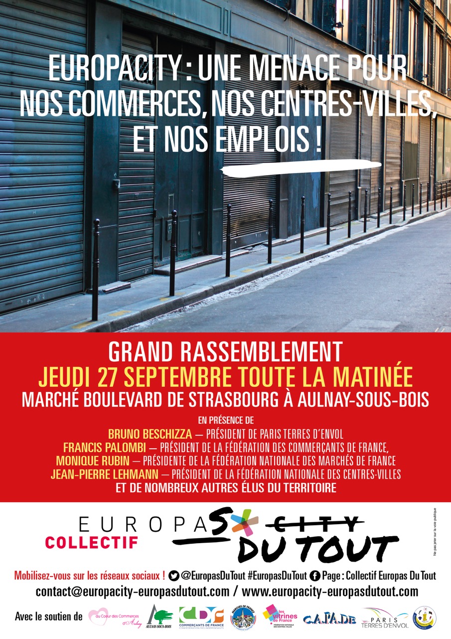 Le collectif Europas du tout, mené par la personnalité locale Alain Boulanger, organise le jeudi 27 septembre le matin un grand rassemblement sur le marché du Boulevard de Strasbourg à Aulnay-sous-Bois. Objectif : sensibiliser la population aux risques encourus par les commerces de proximité et le centre-ville par le grand centre commercial et d’affaires Europa City.