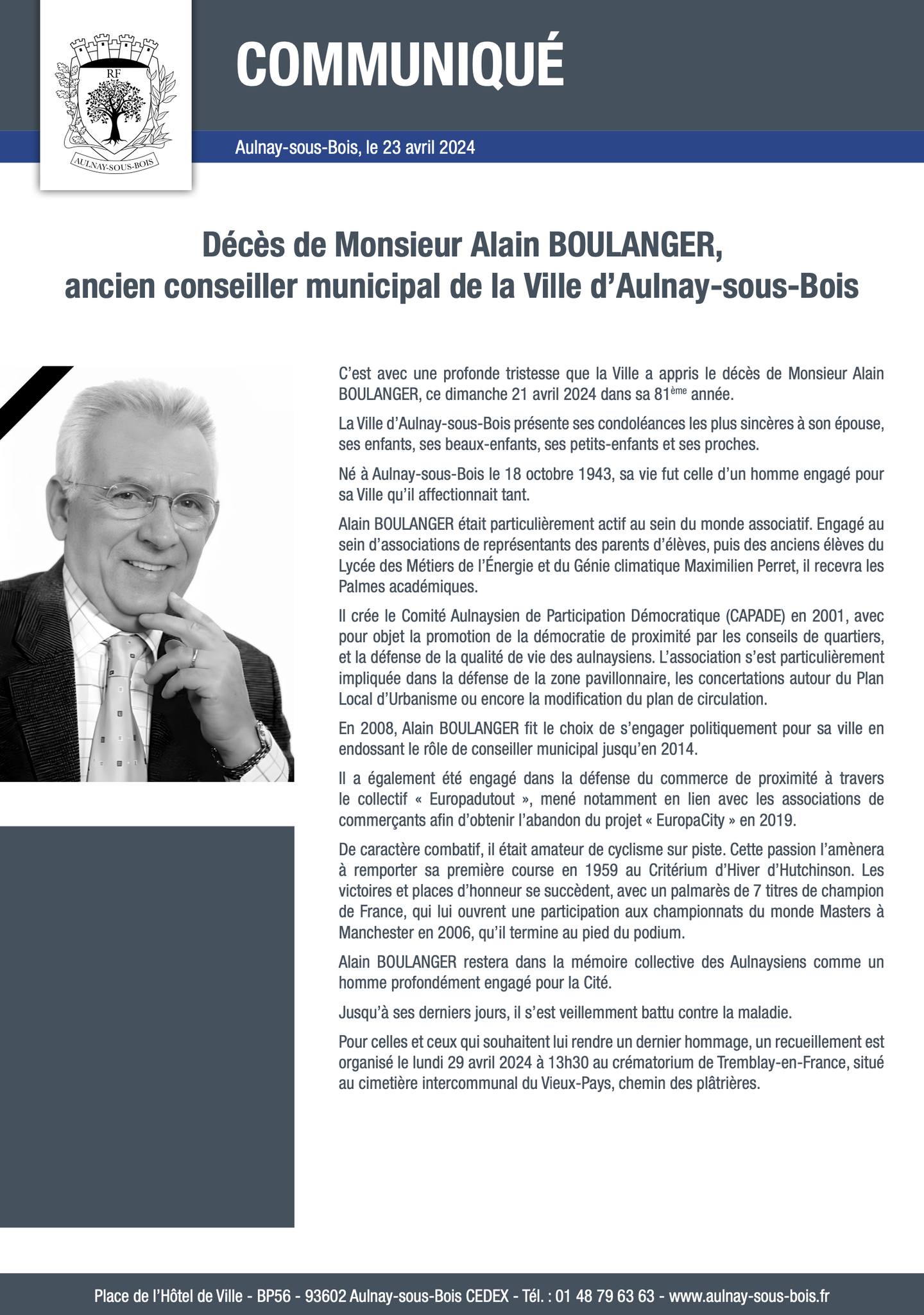 Nous apprenons le décès d’Alain Boulanger, homme politique local, responsable associatif, ancien membre d’Aulnaycap et combattant de la première pour le maintien de la zone pavillonnaire à Aulnay.