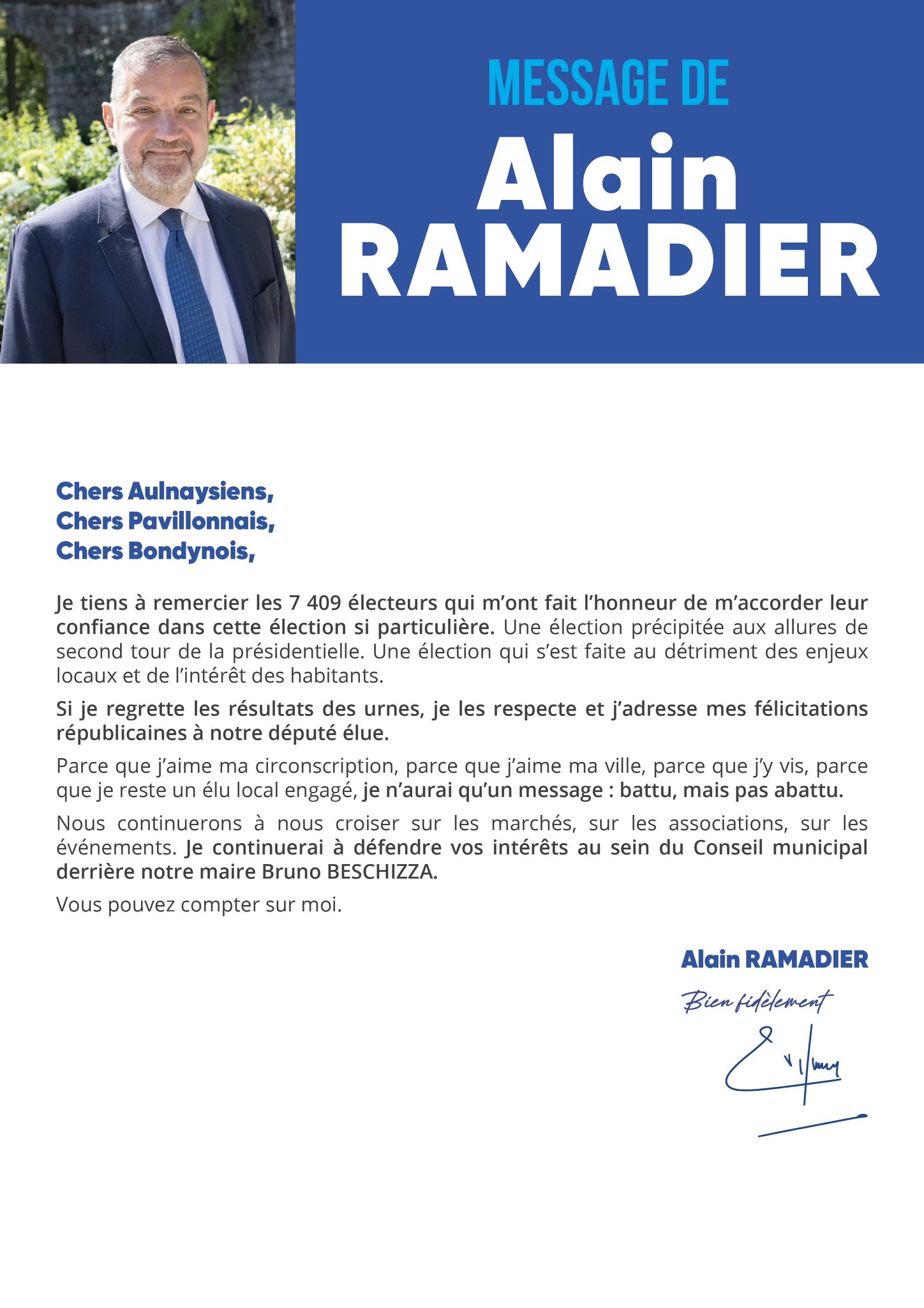 Alain Ramadier arrive une nouvelle fois en 2e position dans la 10e circonscription de la Seine-Saint-Denis (Aulnay-sous-Bois, Bondy Sud-Est, Les Pavillons-sous-Bois). En 2017, il était devancé par le candidat Macroniste Billel Ouadah. Quelques points séparaient les deux candidats.
