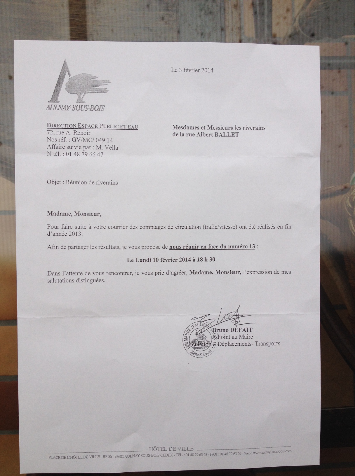 Décidément, la circulation dans la Sud de la ville est un sujet d’une importance capitale pour la campagne des municipales. Les riverains de la rue Albert Ballet (qui lie l’avenue de Nonneville à la Route de Bondy) sont appelé à participer à une réunion bilan sur les comptages de véhicules effectués en 2013. Cette réunion a lieu le lundi 10 février, à 18h30, en face du n°13.