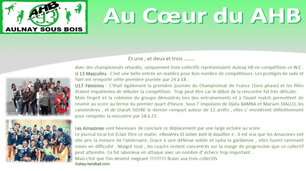 - Encadrement : Le Département et le AHB viennent de connaitre une semaine terrible. George MERLOT, président du Comité Handball 93 (soutien inconditionnel du AHB dans son projet), Thérèse PIES, secrétaire du AHB, membre du CA du comité 93, viennent d’être victimes de ce virus infernal.