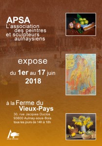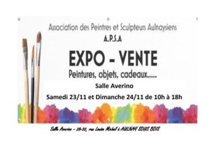 Venez visiter l’expo-vente de l’APSA (Peintres et Sculpteurs d’Aulnay) qui se tiendra les 23 et 24 novembre, de 10hà 18h, Espace Averino, 28-30, rue Louise Michel à Aulnay-sous-Bois.
