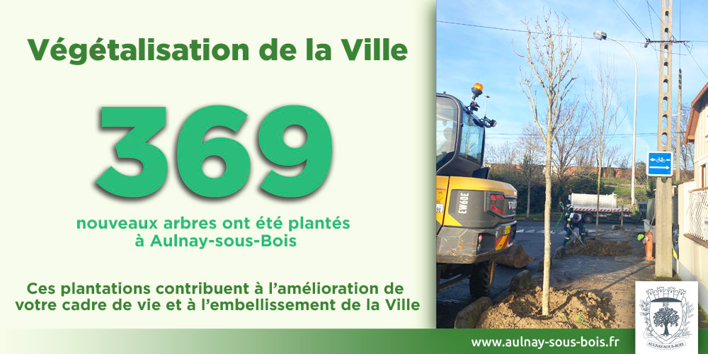 Pour améliorer votre cadre de vie, la végétalisation de la Ville d’Aulnay sous-Bois continue avec la plantation cet hiver de 369 nouveaux arbres à fleurs ou à fruits. Alors que plusieurs arbres seront abattus quartier de Chanteloup et que la disparition de certains arbres centenaires a provoqué une vive émotion chez les plus anciens, ce geste vise certainement à apaiser les esprits.