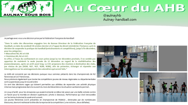 Suite à l’évolution de la situation sanitaire sur notre département, qui nous interdit la présence des joueurs adultes dans les gymnases pour une durée de plus ou moins 6 semaines, le comite Île-de-France handball s’est réunie lundi soir pour prendre la décision suivante : suspension de tous les championnats adultes jusqu’à nouvel ordre.