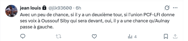 Sur les réseaux sociaux et dans les blogs, il peut compter sur le soutien indéfectible de nos confrères de Gauche, son rédacteur principal et pigiste, Jean-Louis Karkides, estimant haut et fort sur le réseau social d’Elon Musk (pourtant conchié par le propriétaire de ce blog, Hervé Suaudeau), que seul Oussouf Siby peut faire gagner la Gauche à Aulnay-sous-Bois :
