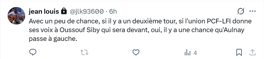Sur les réseaux sociaux et dans les blogs, il peut compter sur le soutien indéfectible de nos confrères de Gauche, son rédacteur principal et pigiste, Jean-Louis Karkides, estimant haut et fort sur le réseau social d’Elon Musk (pourtant conchié par le propriétaire de ce blog, Hervé Suaudeau), que seul Oussouf Siby peut faire gagner la Gauche à Aulnay-sous-Bois :