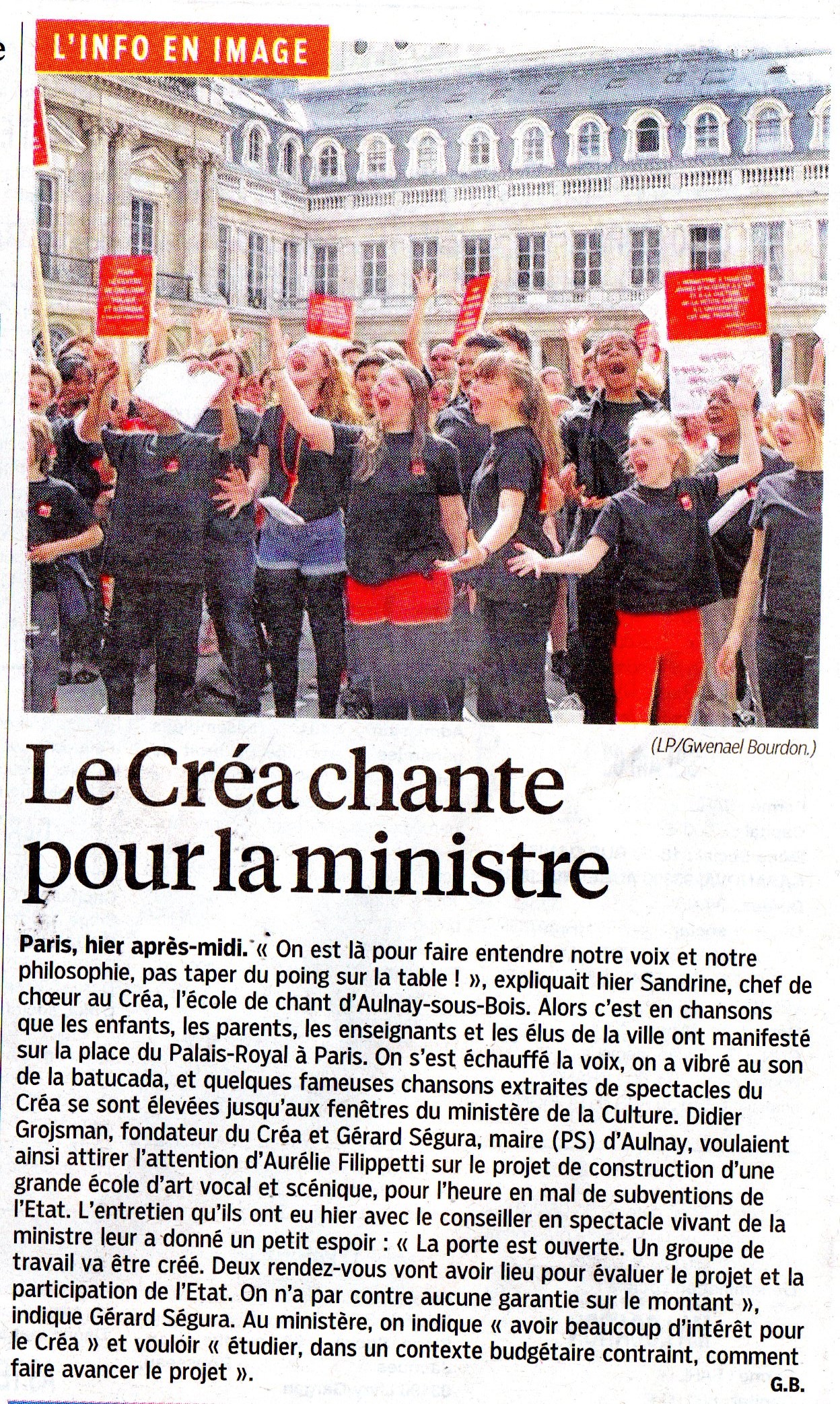 6 juin Le Créa chante pour la ministreLa rédaction vous propose de prendre connaissance d’un article du Parisien, en cliquant sur l’image ci-contre. Le célèbre CREA a chanté hier devant le  bureau de la ministre Aurélie Fillippetti pour réclamer la création d’une école d’art vocal et scénique.