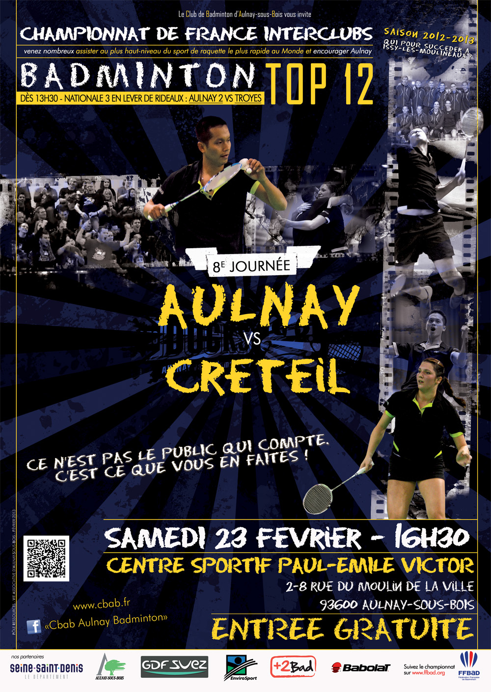 La 8e journée du Championnat de France de Top 12 de Badminton a lieu ce samedi. Le Club de Badminton d’Aulnay-sous-Bois (CBAB) rencontre Créteil, au Centre Sportif Paul-Emile Victor, à partir de 16h30. Il s’agit ici d’un derby qui s’annonce chaud bouillant !