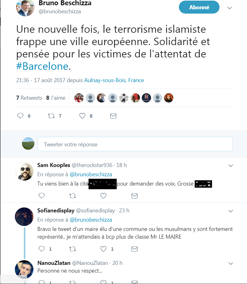 Les commentaires sur le Tweet de Bruno Beschizza, compte géré par lui-même, sont très violents. Est-ce que le Maire va demander la protection fonctionnelle lors du prochain conseil municipal pour attaquer celles et ceux qui l’insultent ? Ou va t-il présenter ses excuses auprès des fidèles lors de sa prochaine visite à la Mosquée d’Aulnay, comme certains l’affirment sur Facebook ?