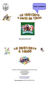 Le dimanche 20 janvier à partir de 14h00, l’ASPE organise cette fois-ci un loto. Réservation possible au 06.52.03.47.62 ou 06.82.17.32.55.