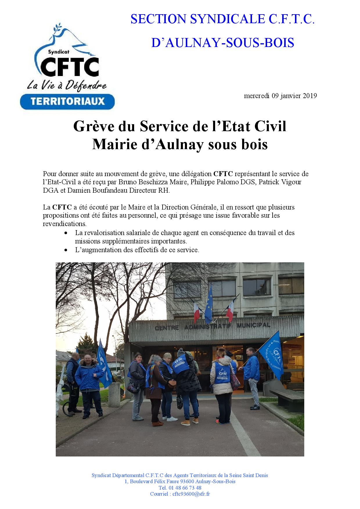 Nous avons l’honneur de vous informer qu’à l’appel du Syndicat Départemental CFTC des Agents Territoriaux de la Seine Saint Denis, les Agents du service de l’Etat Civil de votre collectivité observeront une grève de 24 heures le 09/01/2019.