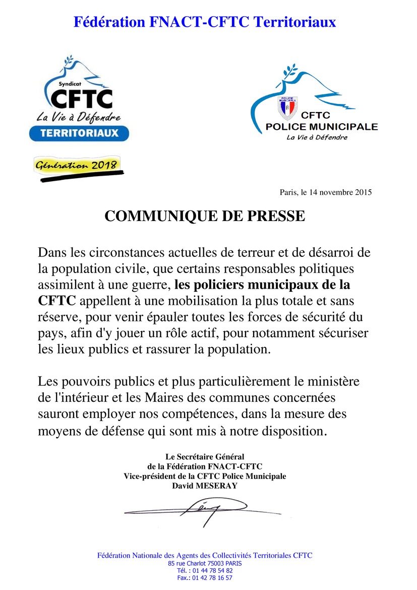 Vous trouverez en cliquant ici ou sur l’image ci-contre un communiqué de CFTC Territoriaux concernant la demande aux Maires des communes de mettre à disposition leur police municipale pour lutter contre le terrorisme. La police municipale d’Aulnay-sous-Bois bientôt réquisitionnée ?