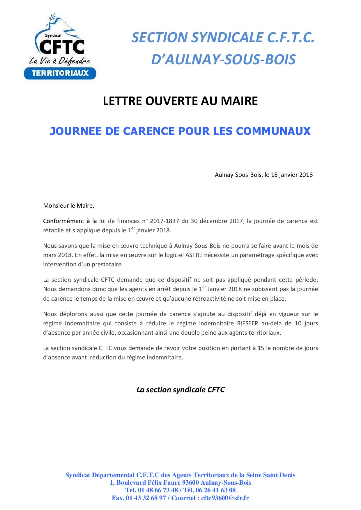 Lettre ouverte de la CFTC au Maire d’Aulnay-sous-Bois concernant la journée de carence