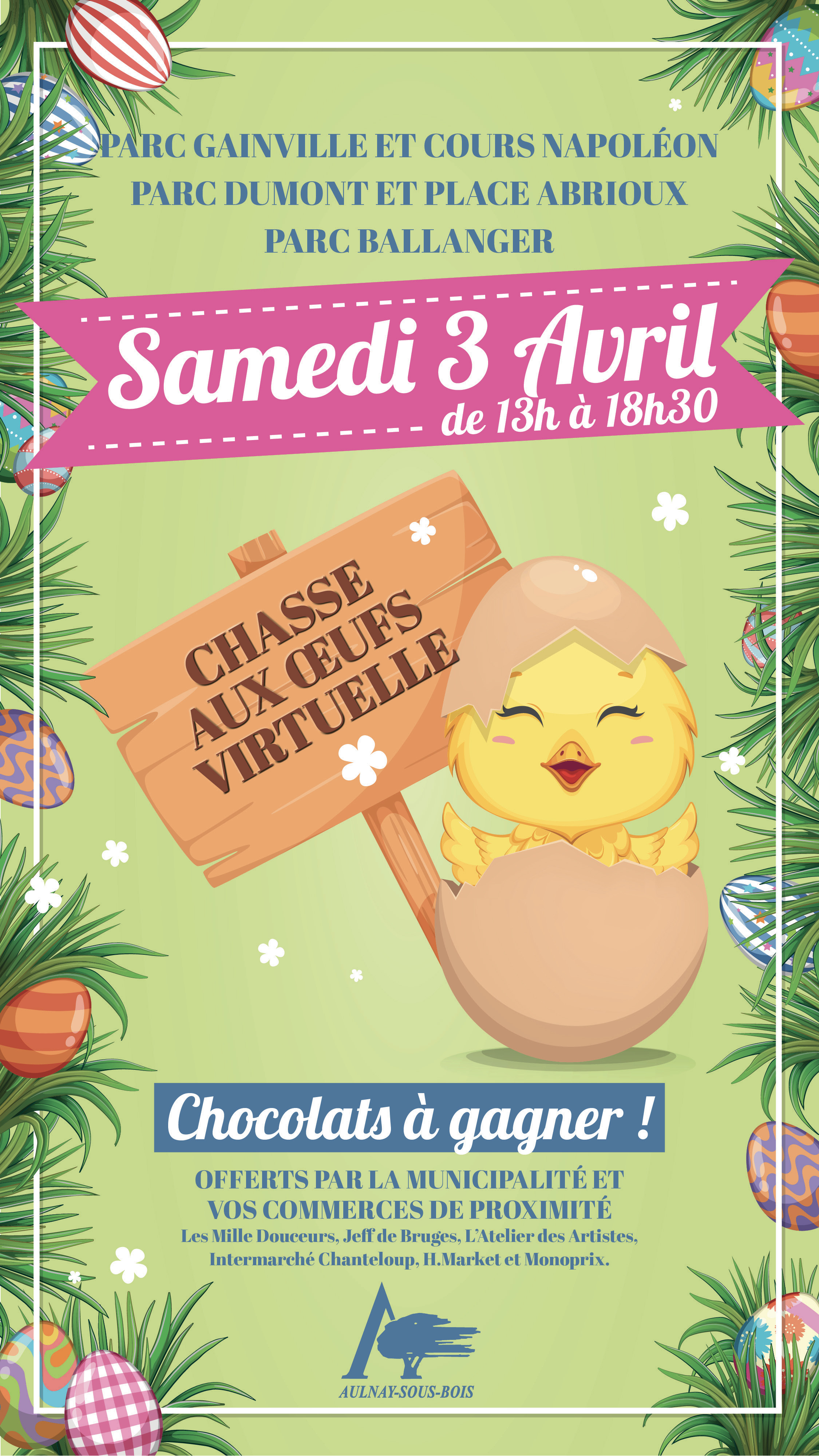 Ce samedi de 13h à 18h30, la Ville d’Aulnay-sous-Bois organise une chasse aux œufs virtuelle dans les parcs Dumont, Gainville et Ballanger. À l’aide de votre smartphone, partez à la recherche du poussin Charlie pour tenter de remporter un lot de chocolats.
