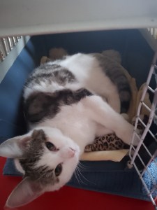 Blanche avec des taches grises, très sociable. Elle attend au chaud qu’on vienne la chercher.