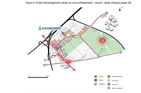 Alors que le projet urbain projette logements, équipements…et l’installation de l’entreprise Chimirec (tel que cela apparait dans l’étude d’impact), on observe un fort glissement dans le mémoire en réponse comme dans le courrier de la ville qui y figure. On comprend que ce projet urbain devra être considérablement modifié puisque les équipements sensibles semblent avoir disparu entre-temps du projet urbain (comparatif des deux plans plan ci-dessous).