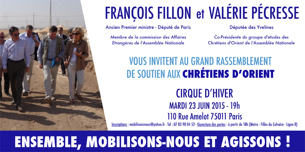 Valérie Pécresse, candidate « Les Républicains » aux Régionales 2015 en Ile-de-France, et l’ancien premier ministre François Fillon vous donnent rendez-vous au Cirque d’Hiver (110 rue Amelot / Paris 11ème) le mardi 23 juin à 19h00. Ils organisent un meeting pour la survie des Chrétiens d’Orient. Plus d’information en cliquant sur l’image ci-contre.