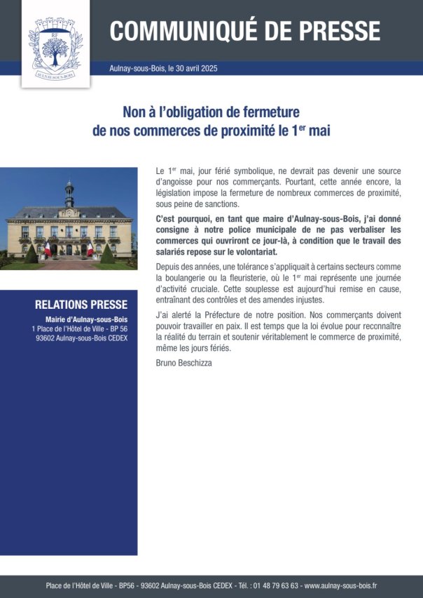 Ce jour férié symbolique ne devrait pas devenir une source d’angoisse pour les commerçants d’Aulnay-sous-Bois selon Bruno Beschizza ! C’est pourquoi en tant que maire d’Aulnay-sous-Bois, il a donné consigne à la police municipal de ne pas verbaliser les commerces qui ouvrent ce jour-là, à condition que le travail des salariés repose sur le volontariat.