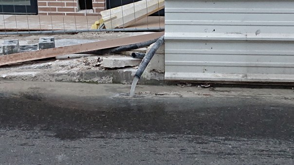 On y voit un tuyau versant de l’eau dans le caniveau, plutôt discret mais dont on entend le bruit incessant de jour comme de bruit. Comme beaucoup d’immeubles récents sur Aulnay, cela doit être la pompe rejetant le trop plein d’eau des sous-sol venant de la nappe fréatique.