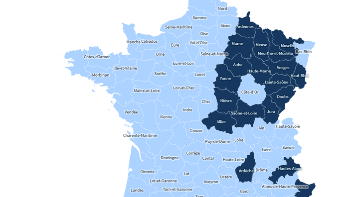 Une liste de 20 départements dont le couvre-feu est avancé à 18h est désormais disponible : les Ardennes, l’Aube, la Marne, la Haute-Marne, la Meurthe-et-Moselle, la Meuse, la Moselle, le Haut-Rhin, les Vosges, le Doubs, le Jura, la Nièvre, la Haute-Saône, la Saône-et-Loire, l’Yonne, le Territoire de Belfort, l’Allier, l’Ardèche, les Hautes-Alpes et les Alpes-Maritimes.