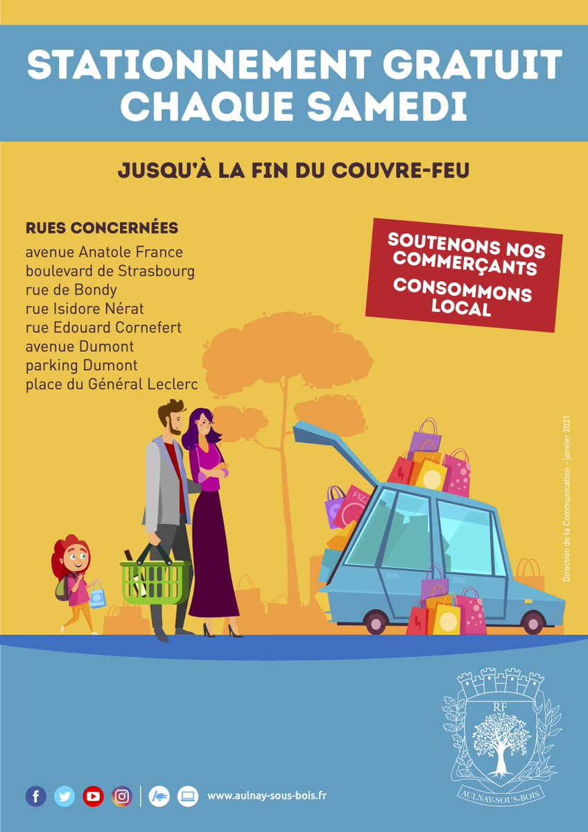 Suite à la mise en place du couvre-feu à 18h qui prive nos commerçants de larges plages horaires d’ouverture, profitez dès aujourd’hui de la gratuité du stationnement chaque samedi en centre-ville. Soutenons nos commerçants, consommons local !