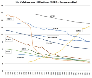 Alors que la France a longtemps pu se targuer d’avoir l’un des meilleurs systèmes de soins au monde, la comparaison internationale du nombre de lits d’hôpitaux sur le temps long permet de prendre conscience du plongeon qu’a connu la France depuis les années 80.