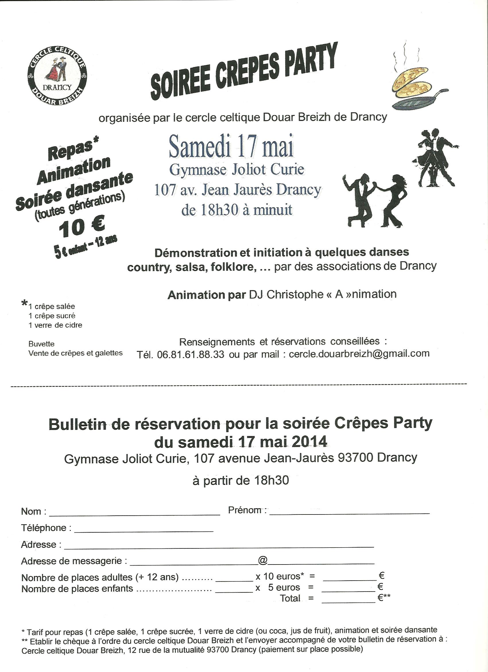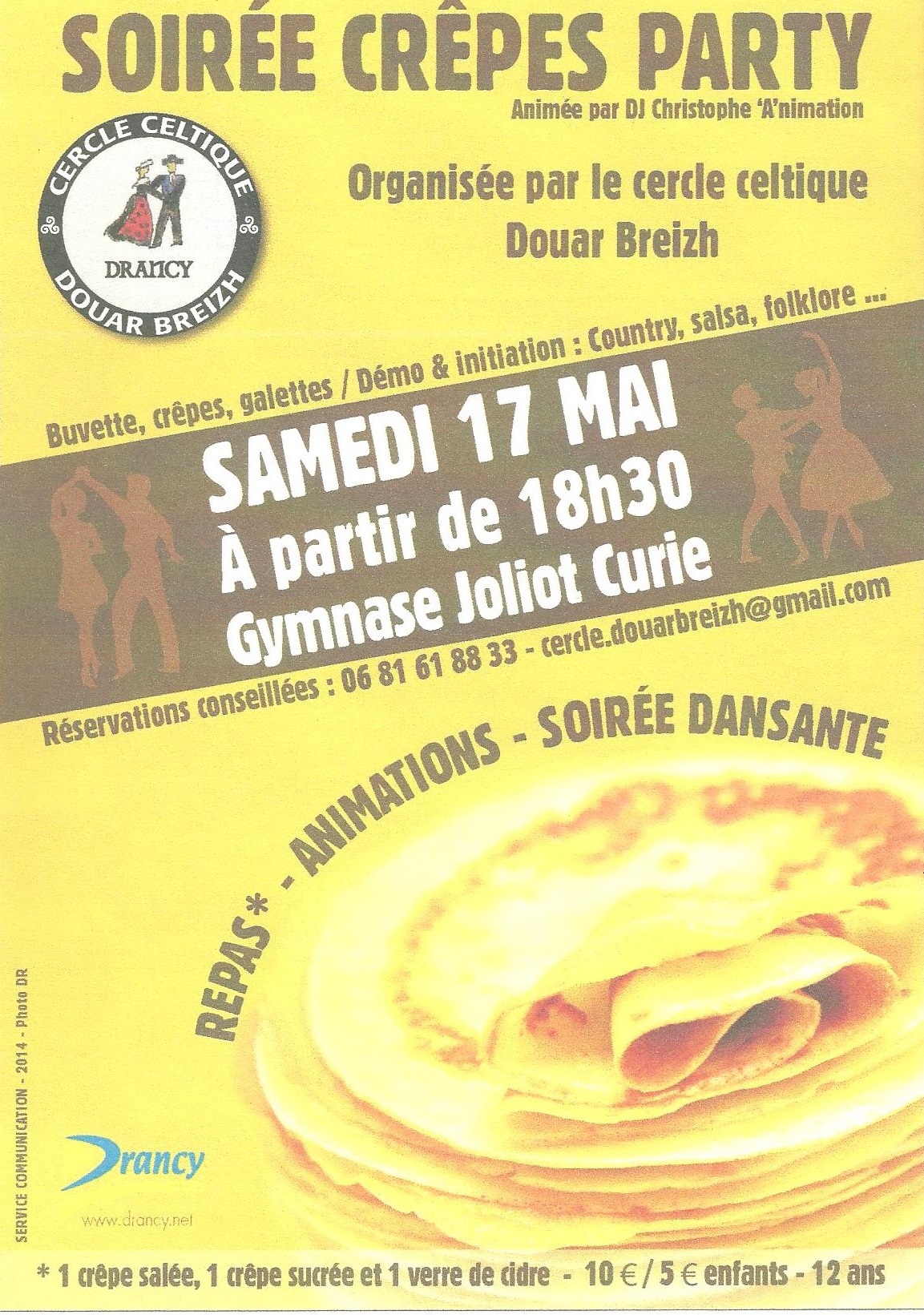 Le CERCLE CELTIQUE DOUAR BREIZH DRANCY organise sa 2eme soirée « crêpes party »(REPAS, ANIMATIONS, SOIREE DANSANTE – toutes générations) le samedi 28 mars 2015 à partir de 18 h 30 jusqu’à minuit.