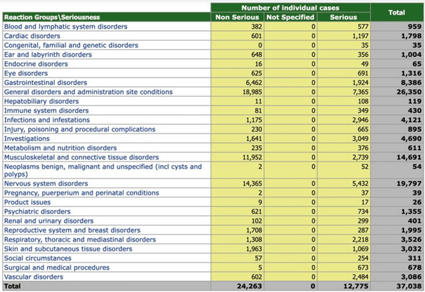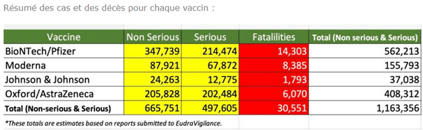 L’innocuité du Pfizer démenti par les chiffres d’Eudravigilance avec un minimum de 14.303 décès et 562.213 cas d’effets indésirables au 13-11-2021