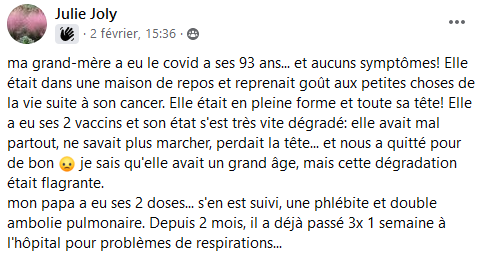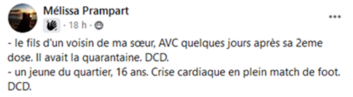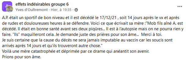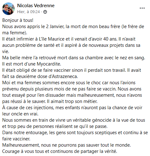 La dépopulation est bien en marche et malheureusement, elle ne fait que commencer ! Depuis cet été je vous informe des effets indésirables de ces injections nocives et inefficaces à protéger du virus et de sa transmission. Nos dirigeants nous mentent et nous manipulent avec le concours des médias pour que nous nous soumettions à ces vaccins dangereux dont les bénéfices sont inférieurs aux risques que l’on vous cache délibérément et qui vous exposent à la dégradation irréversible de votre santé, voire même à la mort. Que de familles dévastées et meurtries depuis le début des vaccinations ! Certains non vaccinés témoignent qu’ils ont contracté le virus et que ce n’était pas plus grave qu’un rhume…. ou une rhinopharyngite ! Pourquoi risquer autant sa vie et sa santé avec un vaccin qui ne protège pas, n’arrête pas les contaminations et engendre autant d’effets graves diversifiés ?
