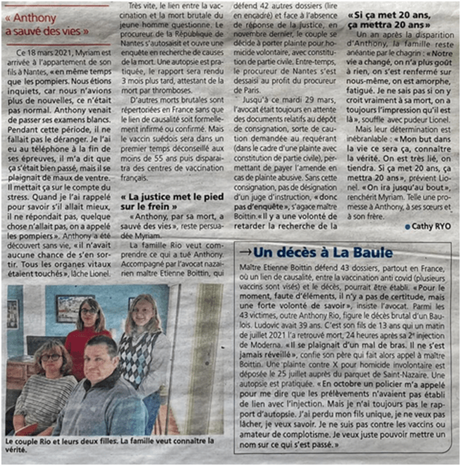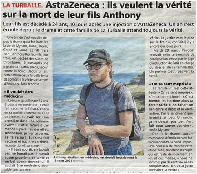 Quel Gâchis ! Quel massacre ! Qu’attendons nous pour l’arrêter ? Nous n’avons pas à accepter l’obligation vaccinale ! Nous devons la combattre et traduire les responsables de cette folie collective devant les tribunaux ! Condoléances aux parents et à ses proches.