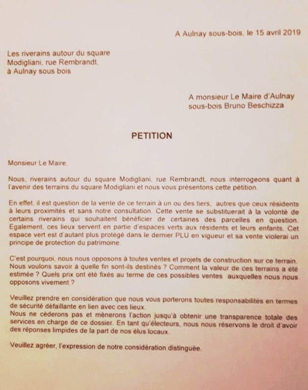 - Une pétition des riverains datée du 15 avril 2019(ci-dessous) s’opposant à cette disparition précisant entre autres que c’est un lieu qui sert d’espace vert aux résidents et à leurs enfants et qu’il est protégé dans le dernier PLU en vigueur et que sa vente violerai un principe de protection du patrimoine !