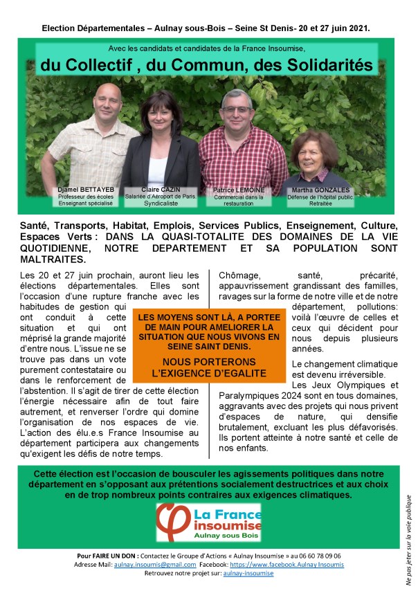 Avec Oussouf SIBY, Christelle CHAT, Boubéka MEDHAOUI et moi-même, les Aulnaysiens voteront pour la solidarité, la démocratie et l’écologie en Seine Saint Denis.