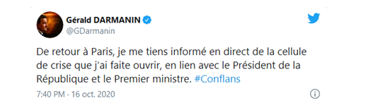 Jean-Michel Blanquer : « C’est la République qui est attaquée » avec « l’assassinat ignoble de l’un de ses serviteurs. Notre unité et notre fermeté sont les seules réponses face à la monstruosité du terrorisme islamiste. Nous ferons face ».