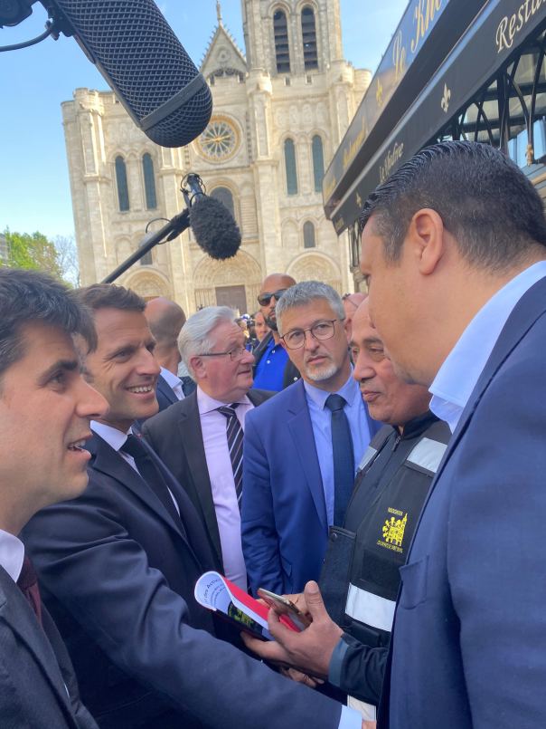 Emmanuel Macron en visite à Saint-Denis, rencontre avec Mohamed Bounoua, représentant Horizons à Aulnay-sous-Bois