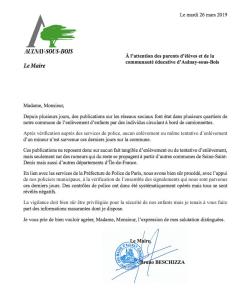 Depuis quelques jours, de nombreux témoignages parlent de tentatives d’enlèvement en région Île-de-France par des personnes en camionnette pour un prétendu trafic d’organes, notamment à Aulnay-sous-Bois. Il en est rien selon la police, et le maire Bruno Beschizza le confirme dans une lettre adressée aux parents d’élèves d’Aulnay.
