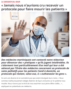 Il s’agit selon ces médecins » de protocoles consistant à faire mourir les malades. On ne peut nous demander à nous médecins de ville, d’euthanasier les malades chez eux. N’y a-t-il pas d’autres alternatives que de tuer les malades ? Jamais nous n’aurions cru un jour recevoir du conseil de l’Ordre des Médecins, un protocole pour faire mourir les patients ! «