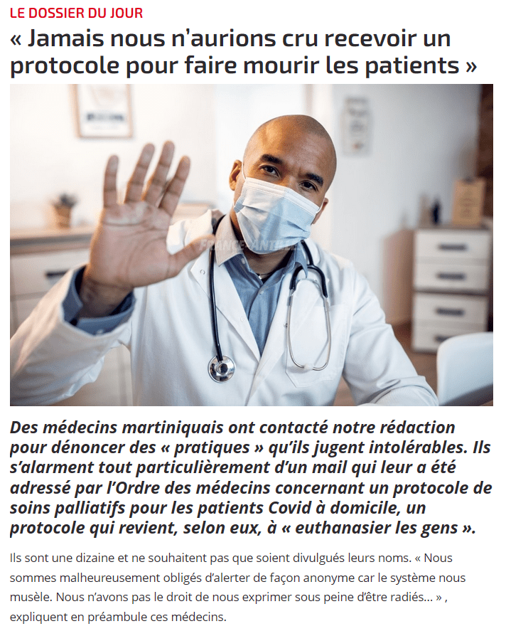 Compte tenu du fait que l’omerta est désormais devenue la règle dans le milieu médical Français sous l’impulsion délibérément orchestrée par nos dirigeants malfaisants qui pensent avoir le droit de contenir et contrôler l’information qui nous est divulguée, des médecins antillais qui veulent être en paix avec leur conscience mais également avec leur déontologie et le serment d’Hippocrate auquel ils ont tous adhéré, se retrouvent à devoir dénoncer sous anonymat des pratiques de soins avec lesquelles ils ne sont plus du tout en accord.
