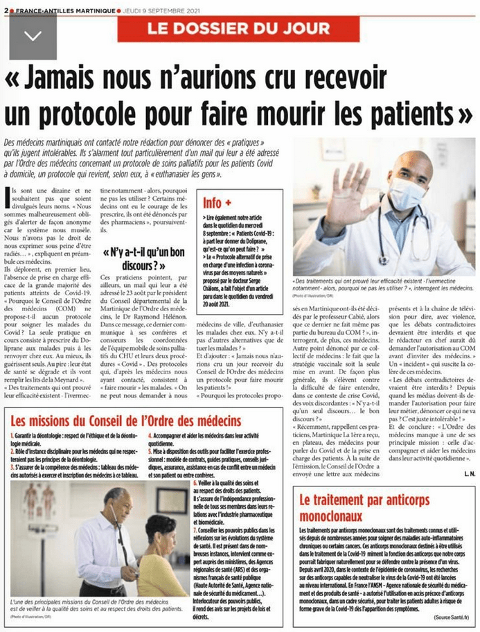 Tous ces praticiens abasourdis et perplexes face à des questionnements pertinents sans réponses, révèlent avoir reçu le 23 Août dernier du Docteur Raymond Hélénon, président du conseil départemental de la Martinique de l’Ordre des Médecins, un mail leur donnant les coordonnées de l’équipe mobile de soins palliatifs du CHU, ainsi que leurs deux procédures Covid à mettre en œuvre….