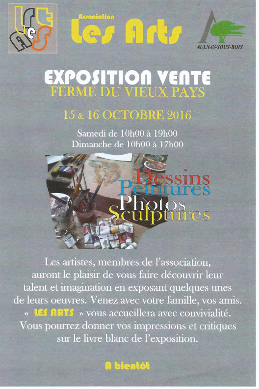 L’association « Les arts » propose une exposition – vente à la ferme du vieux pays d’Aulnay-Sous-Bois, les 15 et 16 octobre 2016.