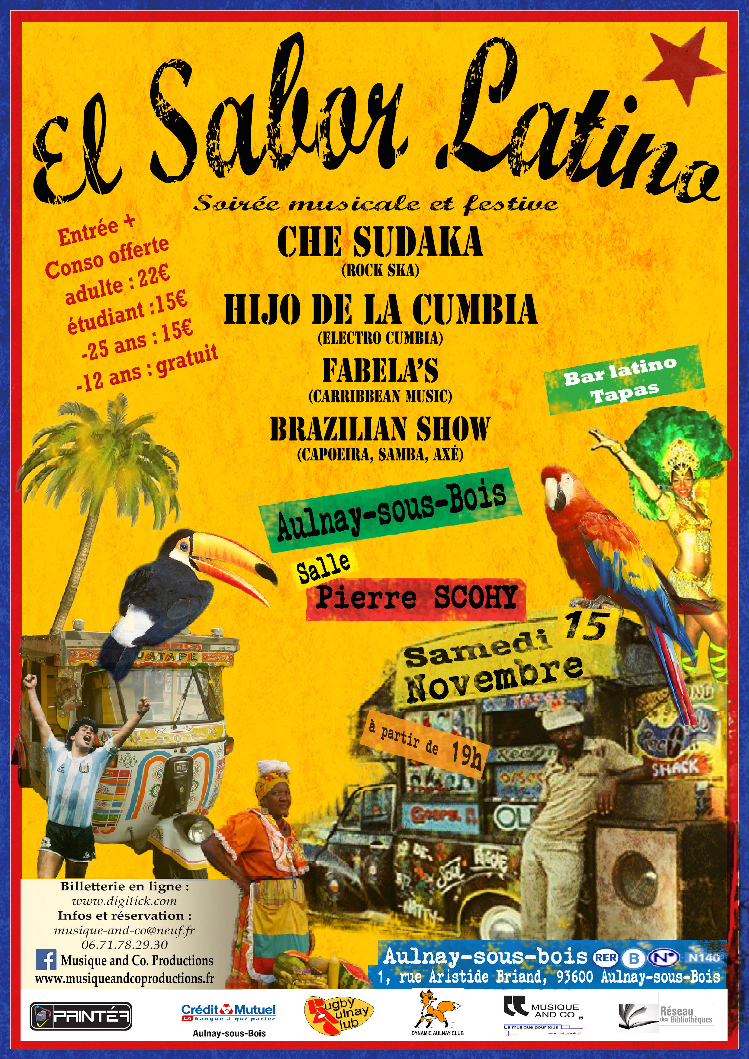 Samedi 15 Novembre 2014, rendez-vous à la salle Pierre SCOHY à partir de 19h pour une soirée spectacle sur le thème de l’Amérique Latine. Au programme, plusieurs concerts, Che Sudaka, Hijo de la Cumbia, Fabela’s, Brazilian show mais aussi de la danse, des spécialités culinaires, et une ambiance de folie!!! Suivez l’actualité de l’évènement sur le site et sur la page facebook de Musique and Co. Productions.