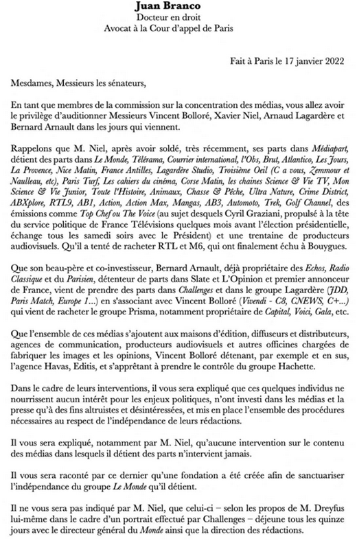 Lettre aux sénateurs collectée le 18 janvier 2022 par Catherine Medioni